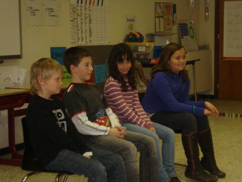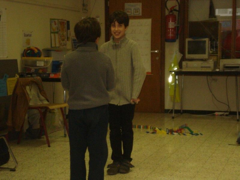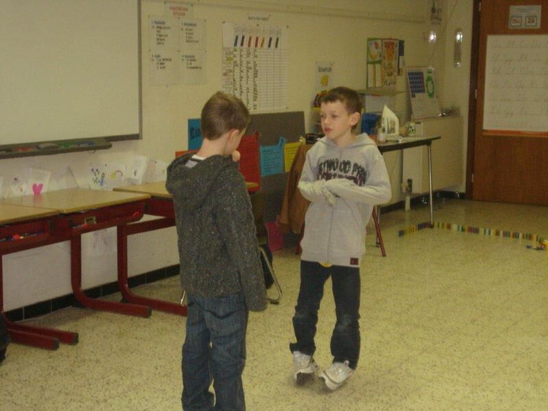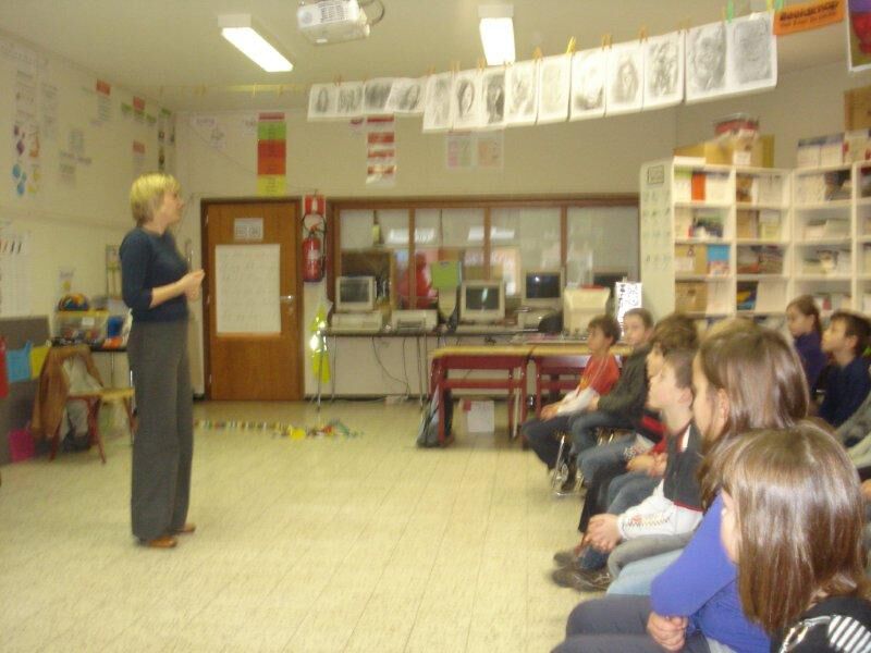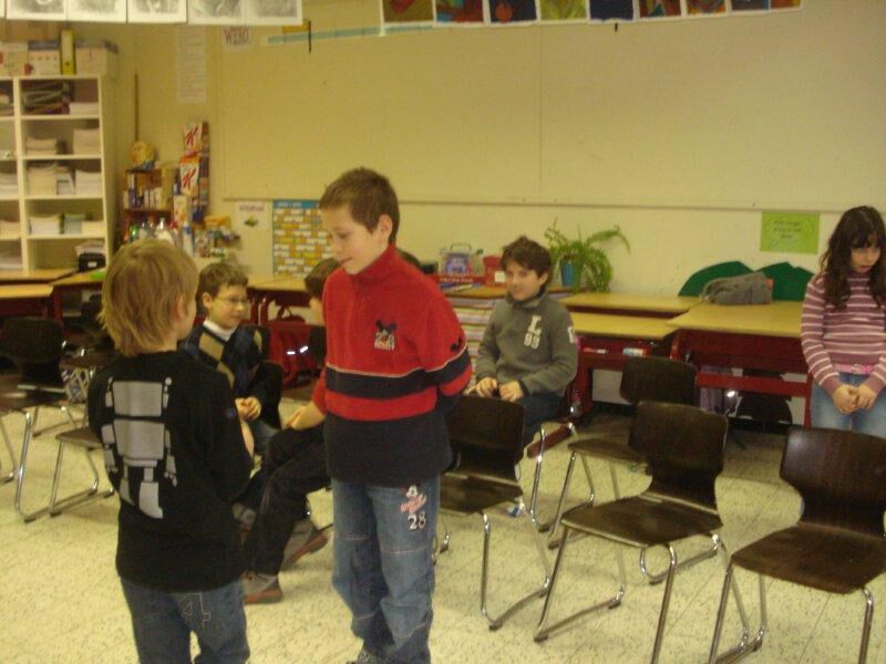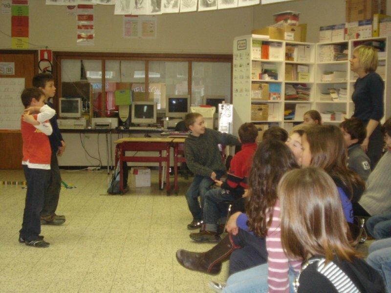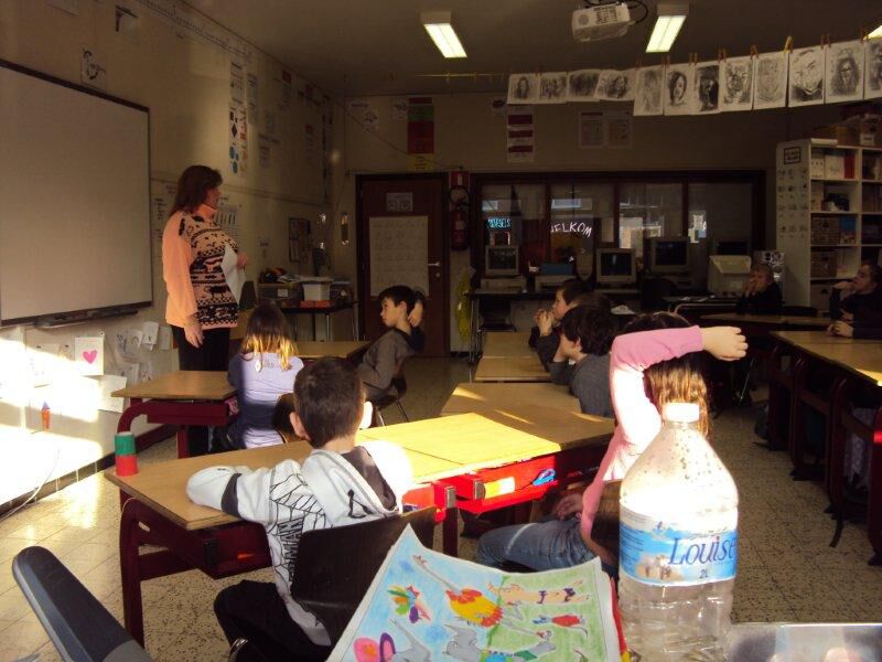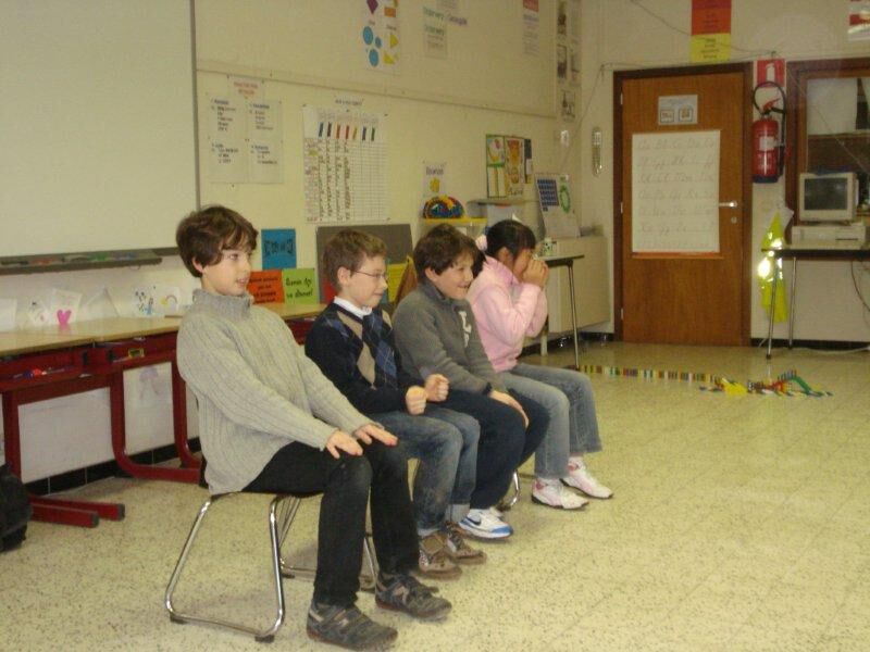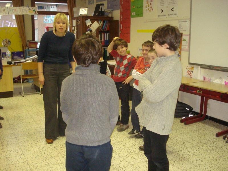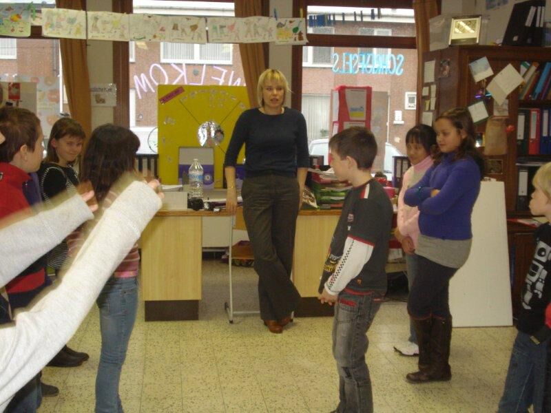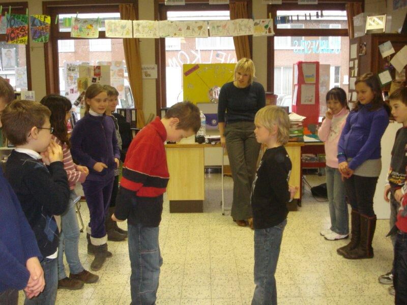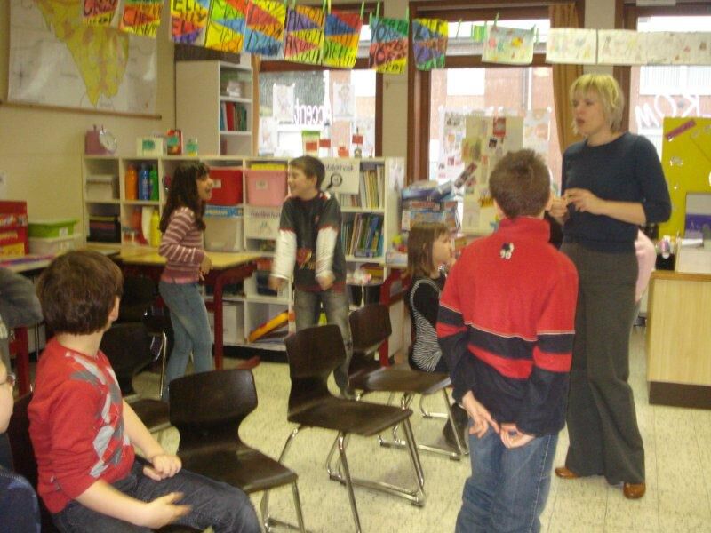 Na de middag zat Katrien in onze klas. Katrien is de juf van Woord in de stedelijke academie. Ze leert kinderen mooi praten, toneeltjes, voordragen,… en in het teken van ‘taal-knap’ kwam ze even naar onze klas. We begonnen met de oefening ‘achterwerk in de kast’, bij deze oefening stelden we onszelf voor. Daarna deden we verschillende oefeningen in verband met gevoelens. Zo leerden we bijvoorbeeld dat we  eenzelfde boodschap door lichaamstaal anders kunnen overdragen.