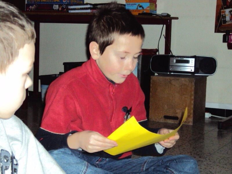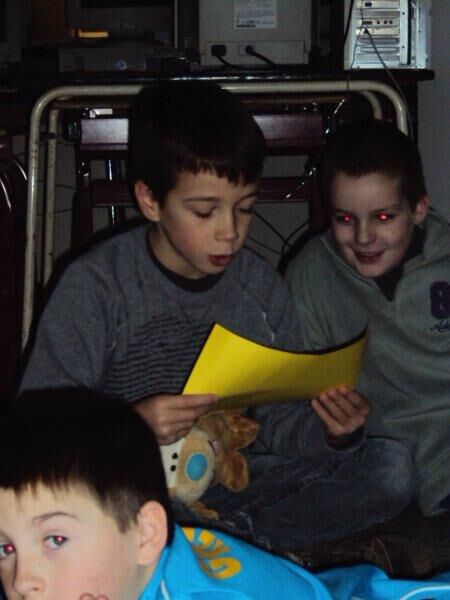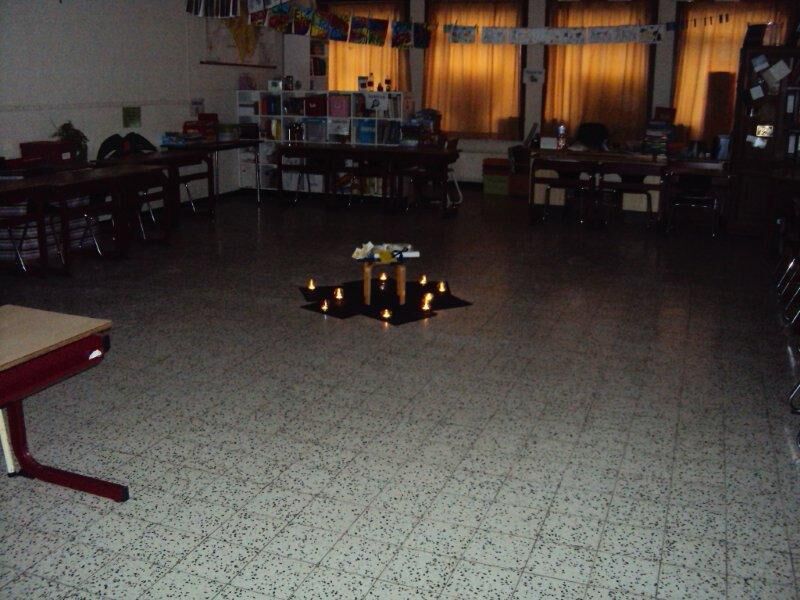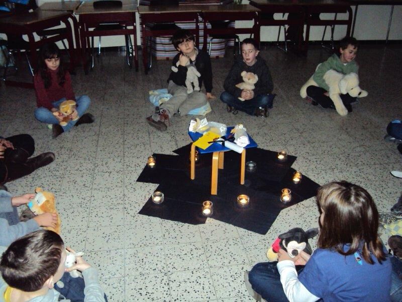 De juf filmde toen we het gedicht allemaal samen aan het uitbeelden waren. Spijtig genoeg zie je alleen de kaarsjes en hoor je de stem van de juf. Onze camera kan dus geen nachtopnames maken….