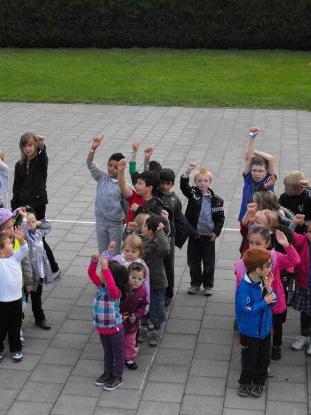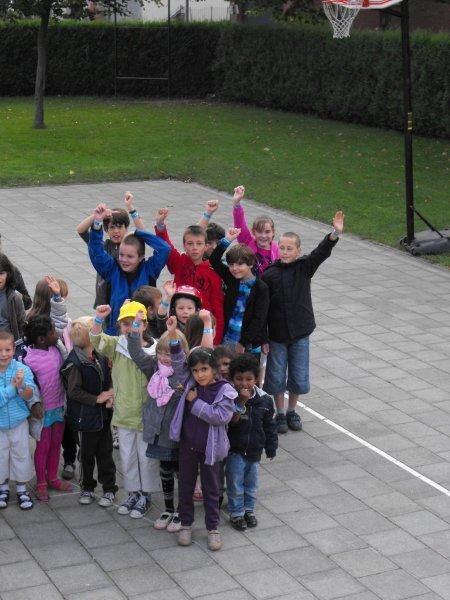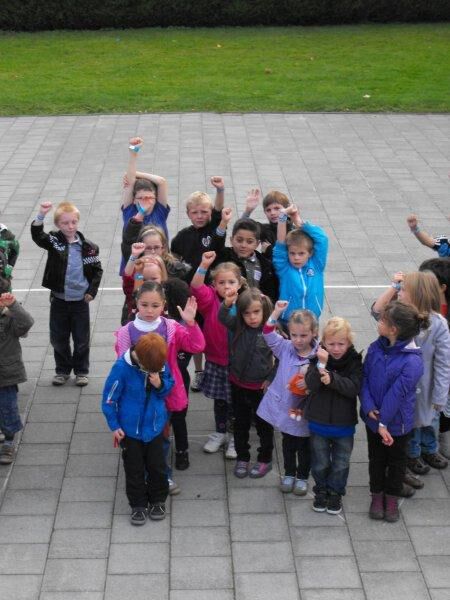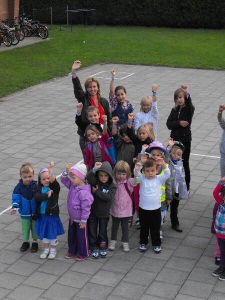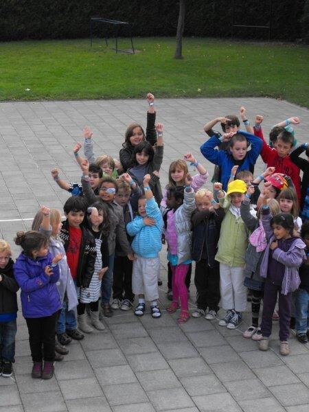 Wij namen deel aan “Saved by the bell”. Elke leerkracht vertelde deze ochtend, op het niveau vande leerlingen, de bedoeling van de actie en legde ook uit hoe wij op school gaan deelnemen. Alle ouders kregen een briefter info. Om kwart voor 12 verzamelden we op de speelplaats en vormden met alle kinderen het vredesteken. Om 5 voor 12 ging de bel. We zongen dan samen het liedje LAAT DE BEL GAAN (op de melodie van Broeder Jacob) en nadien bliezen alle kinderen hun wensen voor alle kinderen van de wereld met een bellenblazer de lucht in.