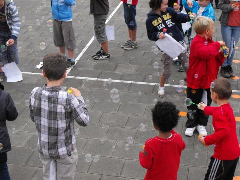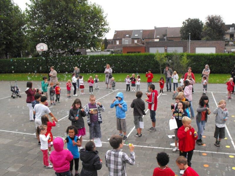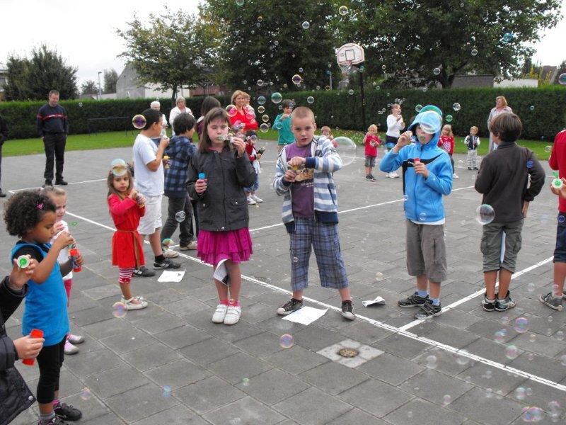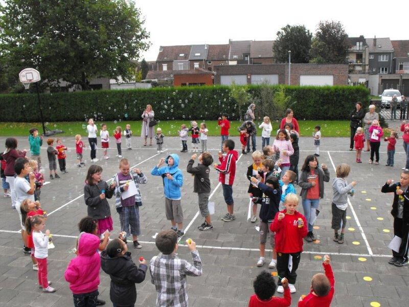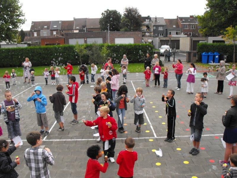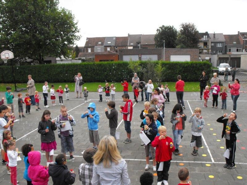 Wij namen deel aan “Saved by the bell”. Elke leerkracht vertelde deze ochtend, op het niveau vande leerlingen, de bedoeling van de actie en legde ook uit hoe wij op school gaan deelnemen. Alle ouders kregen een briefter info. Om kwart voor 12 verzamelden we op de speelplaats en vormden met alle kinderen het vredesteken. Om 5 voor 12 ging de bel. We zongen dan samen het liedje LAAT DE BEL GAAN (op de melodie van Broeder Jacob) en nadien bliezen alle kinderen hun wensen voor alle kinderen van de wereld met een bellenblazer de lucht in.