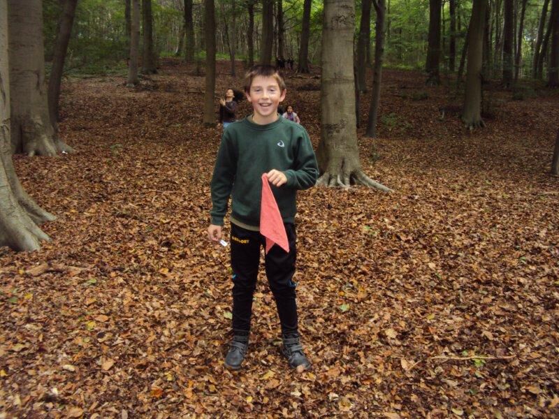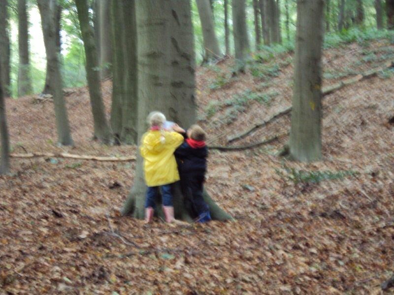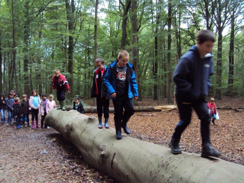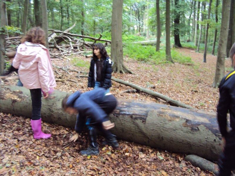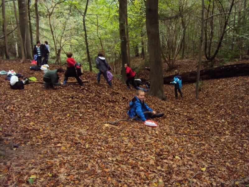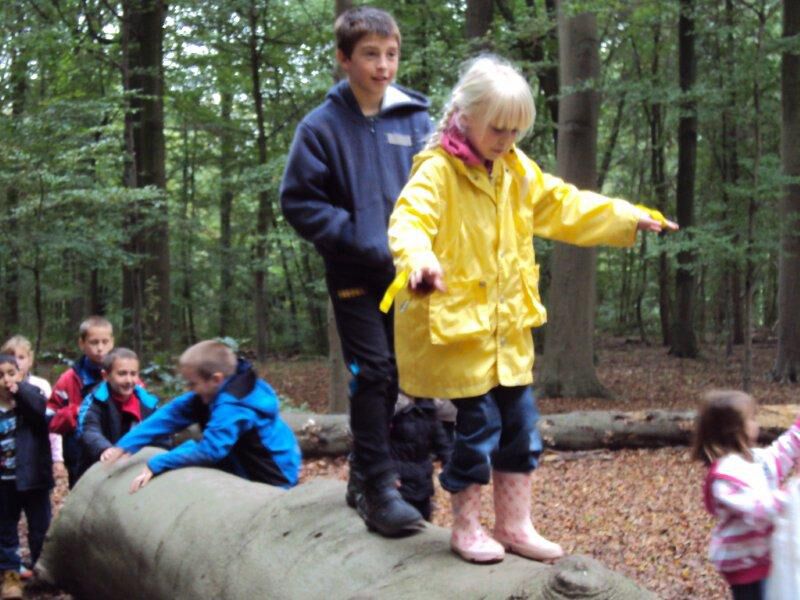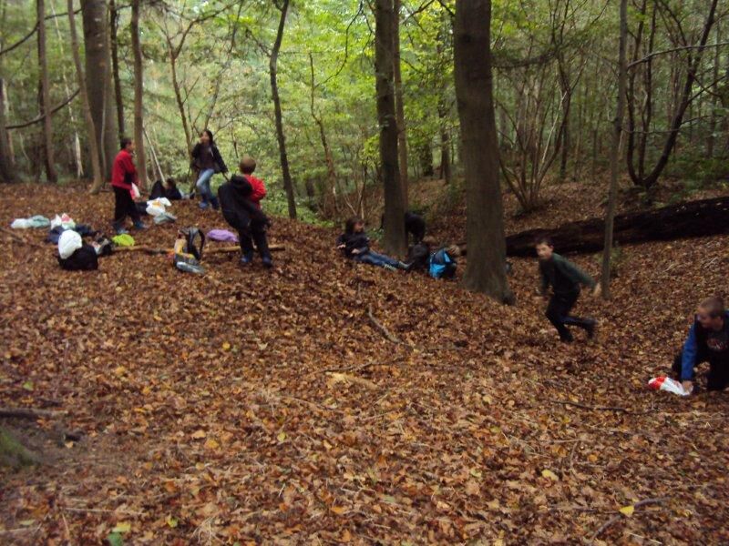 Samen met de kleuters en de eerste graad trokken we naar het Neigembos. Na het beklimmen van de grote trap zochten we een goed plaatsje om aan het werk te gaan. We speelden een groot ganzenbordspel waarbij we allerlei opdrachten moesten doen. We zochten vier verschillende blaadjes, het allermooiste herfstblad, sprongen over boomstammen, maakten een afdruk van boomschors, wandelden over een boomstam,.... Als afsluiter speelden we bos-stratego en rolden we enkele kleine heuveltjes af.