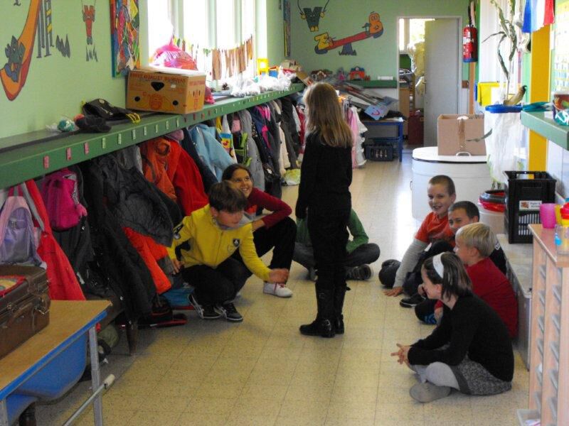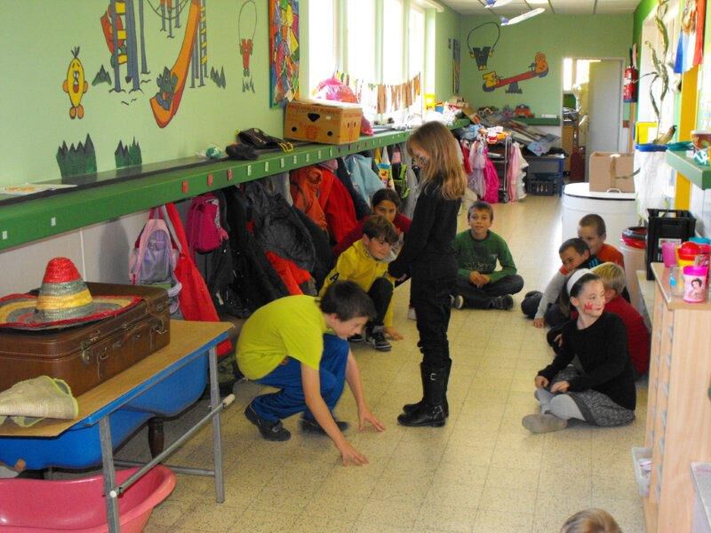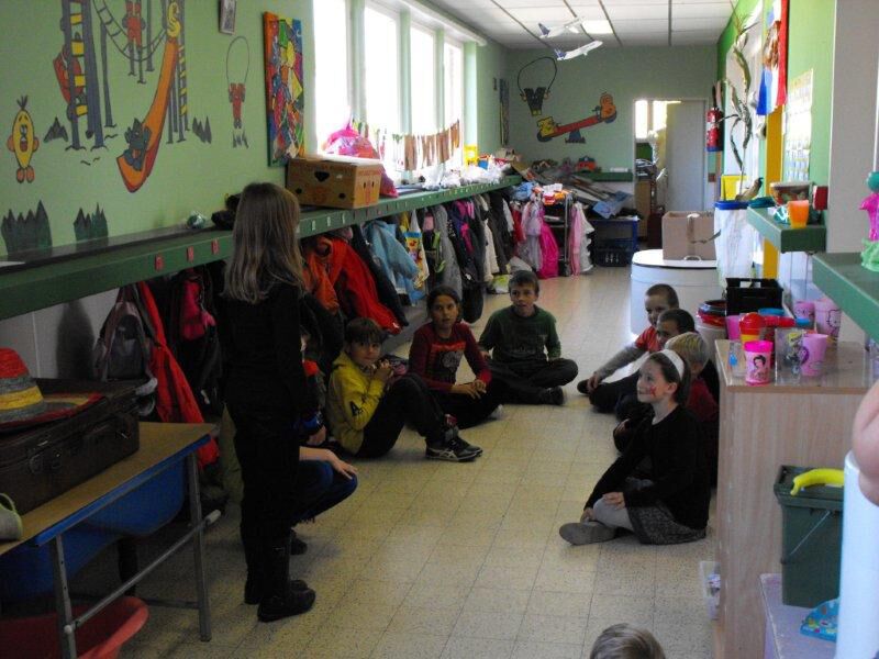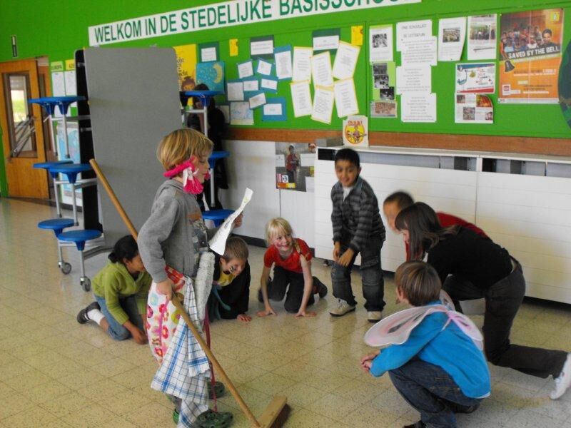 Vandaag stonden de zenuwen gespannen... Het laatste lesuur traden we immers op voor de kleuters. We brachten hen 'de toneelvoorstelling' van het prentenboek 'Jonnie'. We deden enorm hard ons best om onze zinnetjes uit het hoofd te kennen en hadden zelfs passende kledij aan. Eén groepje (met Jonnie-Hind) bracht de voorstelling in de refter voor de tweede en derde kleuterklas, de andere groep (met Jonnie-Jade) bracht de voorstelling in de gang voor de eerste kleuterklas. Volgende week doen we onze voorstelling nog eens opnieuw en dit op vraag van de kleuterjuffen (volgende week werken ze immers een volledige week rondom het thema spinnen).