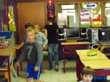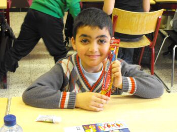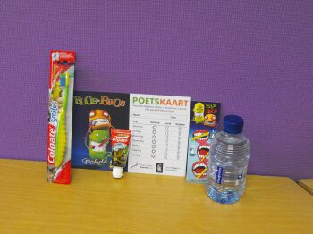 Vandaag kregen we bezoek van Glimlachen.be. Ieder jaar komen zij ons wat meer vertellen over ons gebit en hoe we dat op een correcte manier moeten verzorgen. Dit jaar werd onze kennis getest aan de hand van een heuse tandenquiz. Superleuk! Zeker met al die leuke filmpjes over Flos en Bros tussendoor Achteraf werd iedereen beloond met een flesje water, een nieuwe tandenborstel, een sticker, een tube tandpasta en een poetskaart! Poetsen maar!
