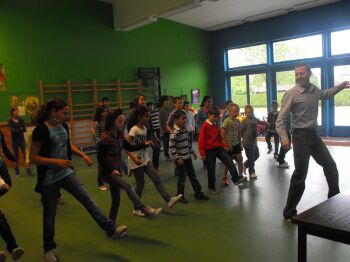 Eerst leerden we het liedje 'In de late uren' onder leiding van een klein orkestje. Daarna gingen we naar de grote zaal en oefenden we het bijhorende dansje. Vervolgens repeteerden we het toneeltje.