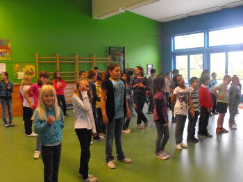 Op het einde trokken alle kinderen (van alle aanwezige scholen) naar de grote zaal om samen een voorstelling te geven. We speelden eerst het toneeltje en zongen en dansten dan het liedje.