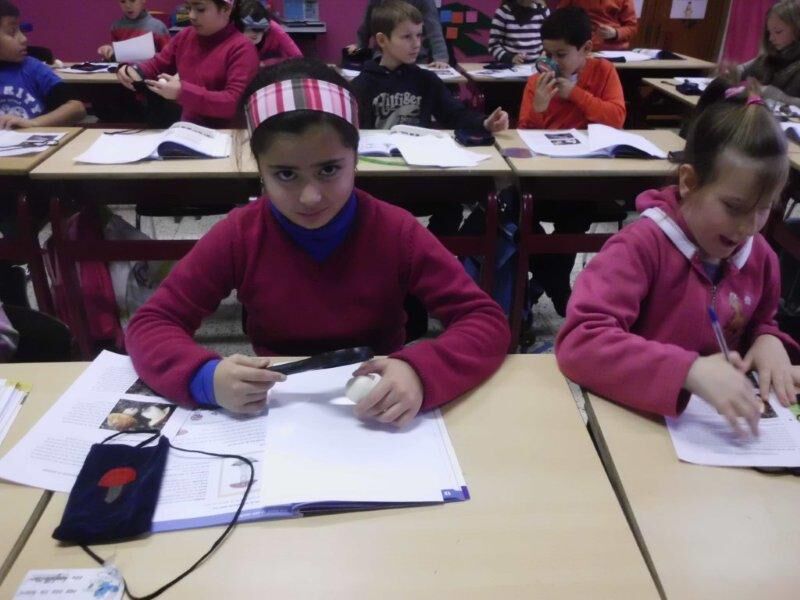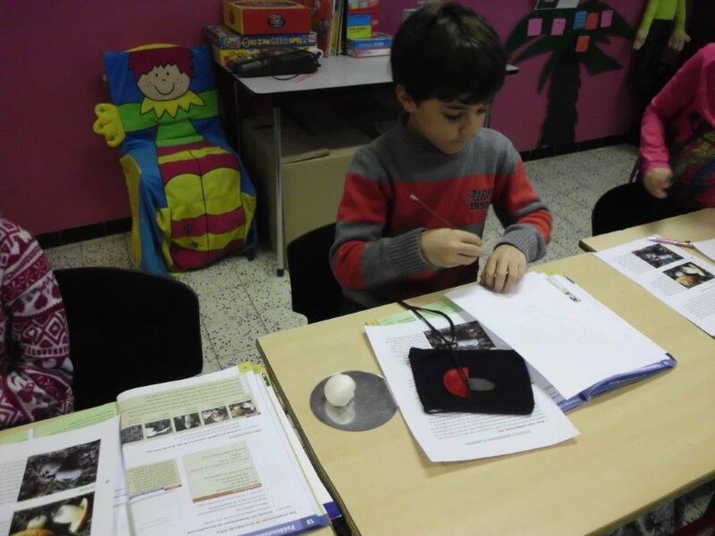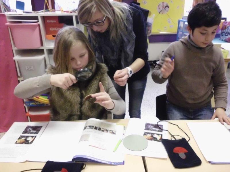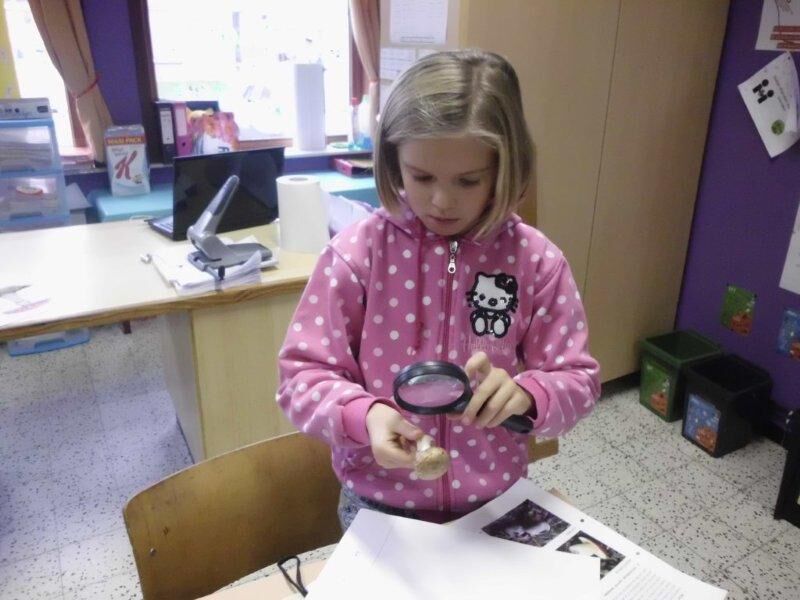 Vandaag kregen we van juf Silke les over de paddenstoelen. Ze bracht een heleboel materiaal mee. Per twee kregen we een paddenstoel, een spiegel en een loep. Daarmee moesten we onze paddenstoel bestuderen en nagaan of er buisjes of plaatjes waren. Het was een leerzame les!