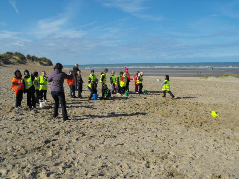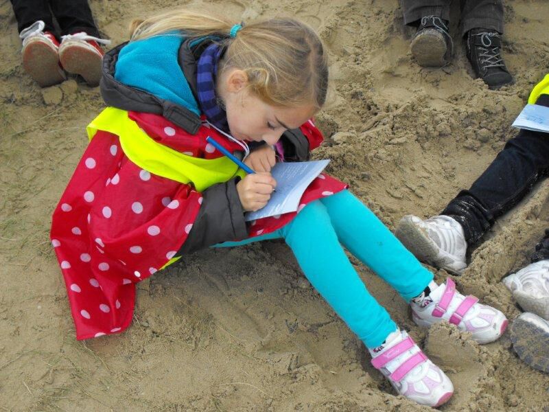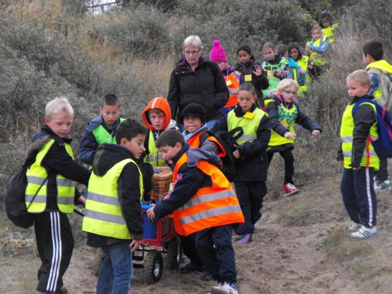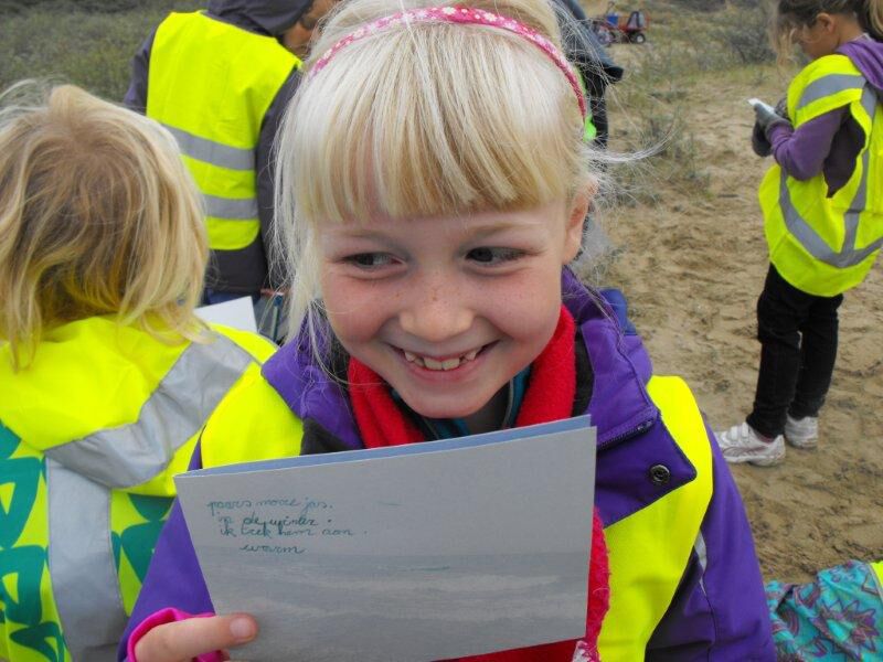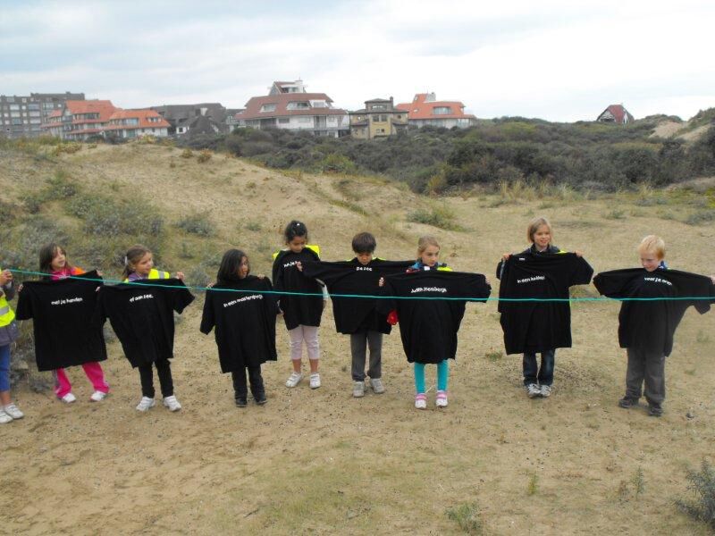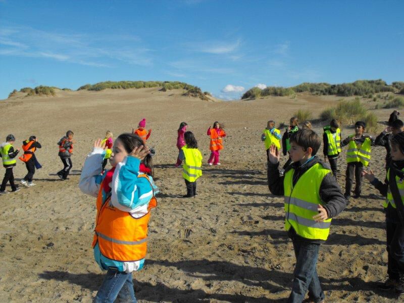Rond 9:30 sprongen we in onze stapschoenen en maakten we een fikse wandeling richting ‘het duinenhuis’. Daar aangekomen gingen we eerst aan de slag met de duinpoëziekoffer. We rangschikten T-shirts waardoor we een gedicht kregen aan de waslijn, we schreven een elfje, riepen boodschappen naar de zee,…  Na een stevige picknick namen juf Charlotte en juf Cindy het roer over. We deden een heleboel spelletjes in de duinen en rolden de duinen eens af. Wat was dit leuk!