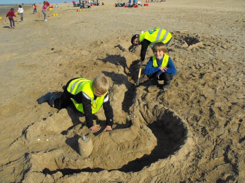 ’s Middags aten we een overheerlijke pastasalade en kregen we chocoladepudding en fruit als dessert. Daarna keerden we terug naar het strand voor een heuse zandkastelenwedstrijd. De weergoden waren ons héél goed gezind en zorgden voor een stralende hemel en weinig wind. Dat nodigde natuurlijk uit om net ietsje te diep te gaan in de plassen en de zee, met alle gevolgen vandien… Een echte winnaar was er niet. Elke zandkasteel kreeg een ‘naam’. Zo was er het mooiste, het meest beveiligde, het creatiefste,…zandkasteel.