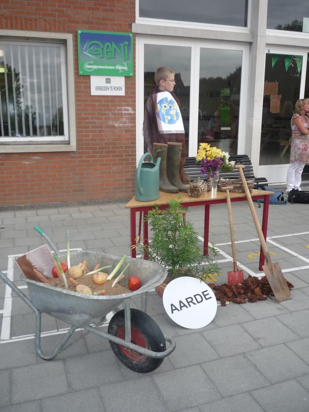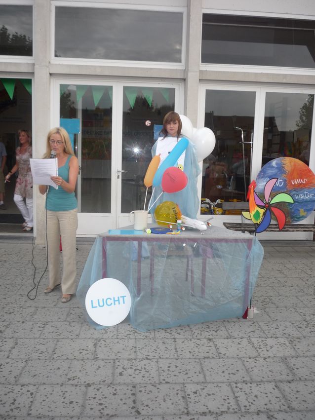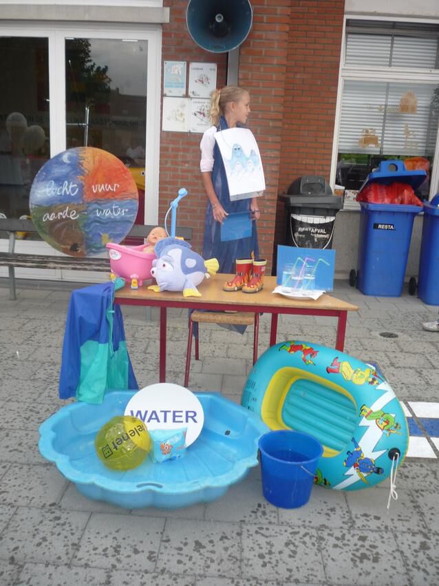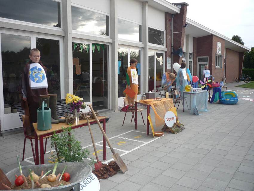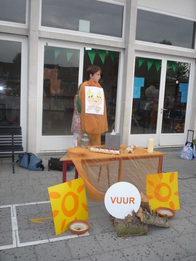 Vooraan op de speelplaats stonden vier tafels. Op de eerste stonden dingen die ons deden denken aan aarde, op de tweede vuur, op de derde lucht en op de laatste water. Toen de schoolbel ging nam juf Ann het woord. Ze verwelkomde iedereen en gaf wat uitleg over ons nieuwe schoolproject ‘De 4 natuurelementen”. Er kwam zelfs een aardekind, een vuurkind, een luchtkind en een waterkind aan het woord. Samen zongen we een liedje van Urbanus.