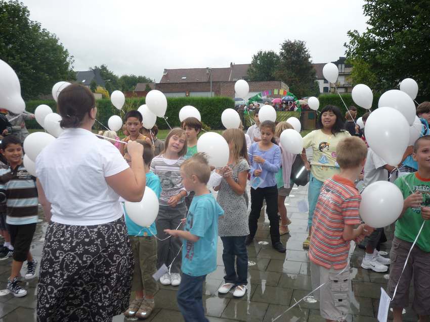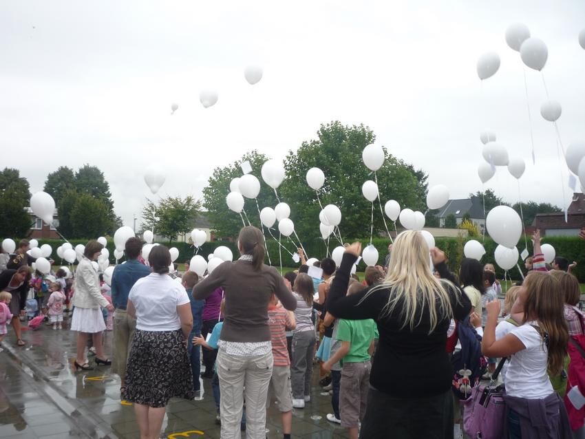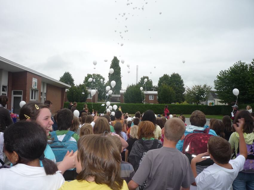 Na de kennismaking in de klas kregen we een kaartje. Hierop schreven we een wens. Om 15u15 gingen alle leerlingen naar buiten met hun wens aan een witte ballon (die gevuld was met helium). We lieten ze samen op.