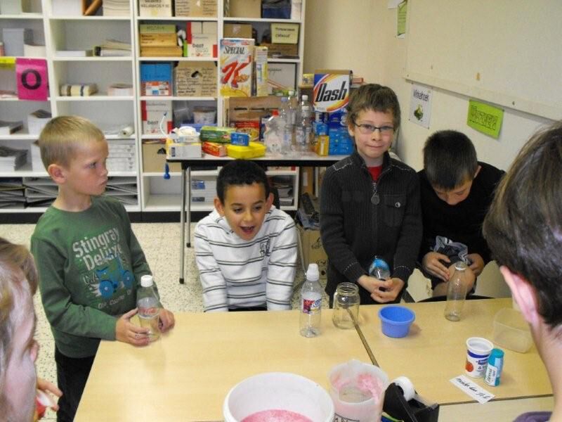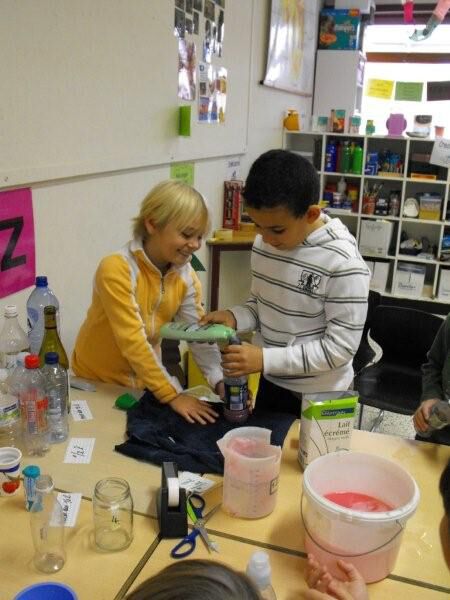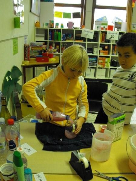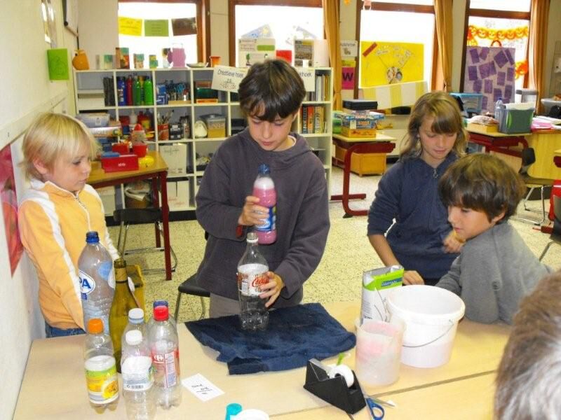 Enkele weken geleden vroeg de juf aan ons (en onze ouders) om wegwerpmateriaal te verzamelen. We deden heel erg ons best. (Onze poetsvrouw kreeg zelfs enkele grijze haren door naar de grote ‘hoop’ te kijken.)