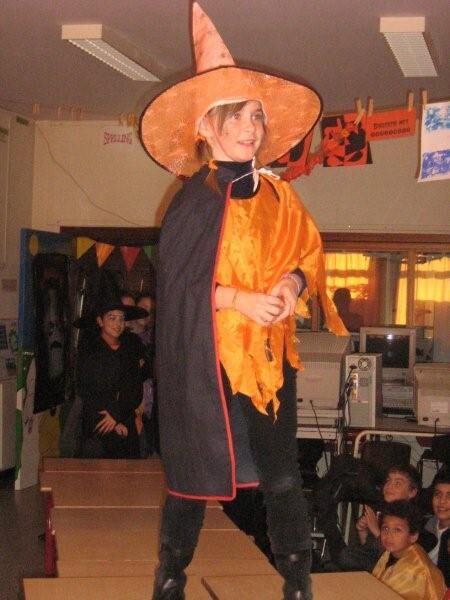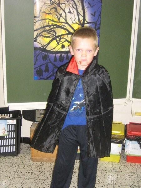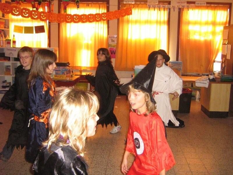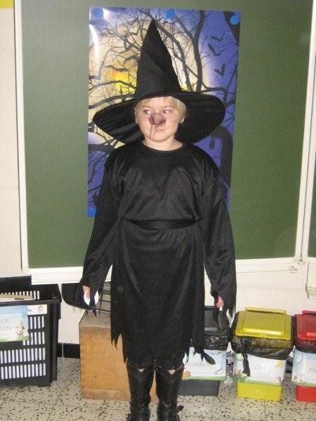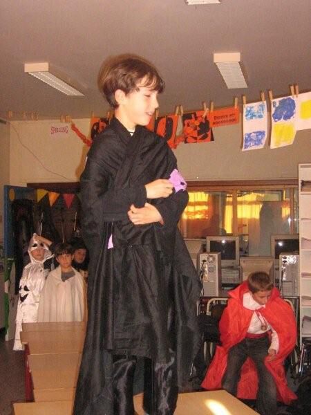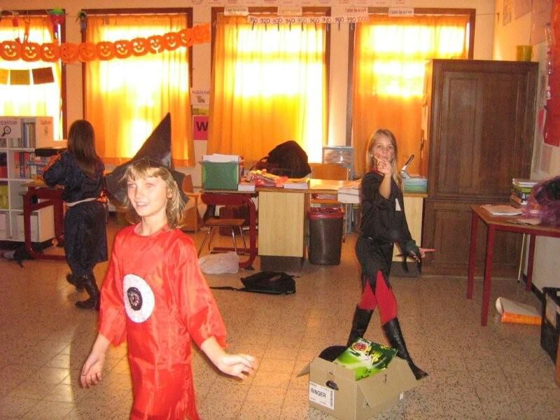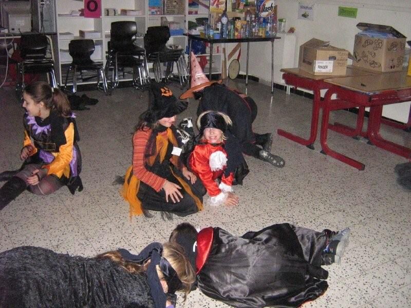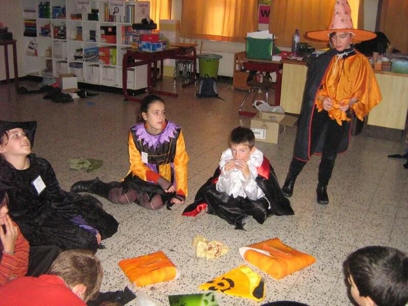 Bij onze juf begonnen we met de spelletjes vampiertje en vampiertikkertje. Daarna mochten we het verhaal van ‘De Heksen’ van Roald Dahl uitbeelden. We leerden ook enkele liedjes (Heksensabbat, De griezelige tovenaar en Zeven heksen) en sloten af met een kort spelletje.