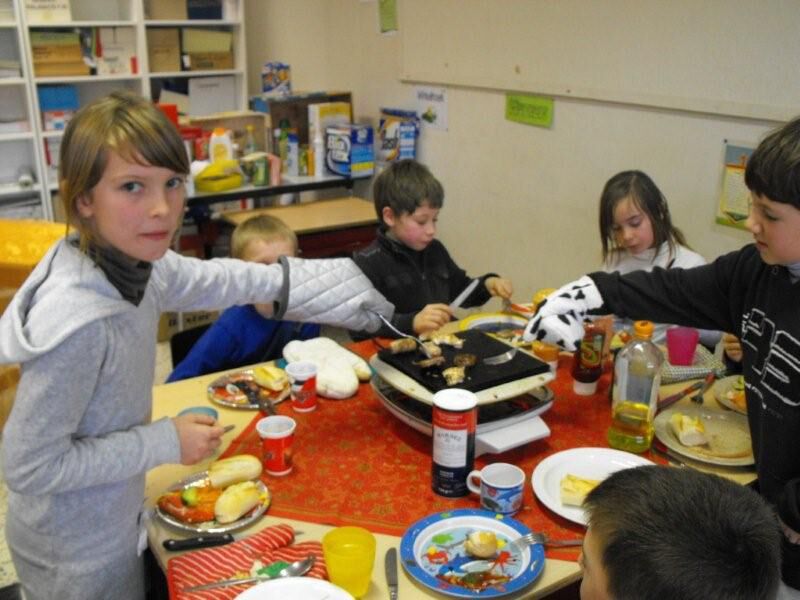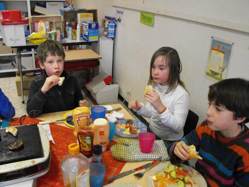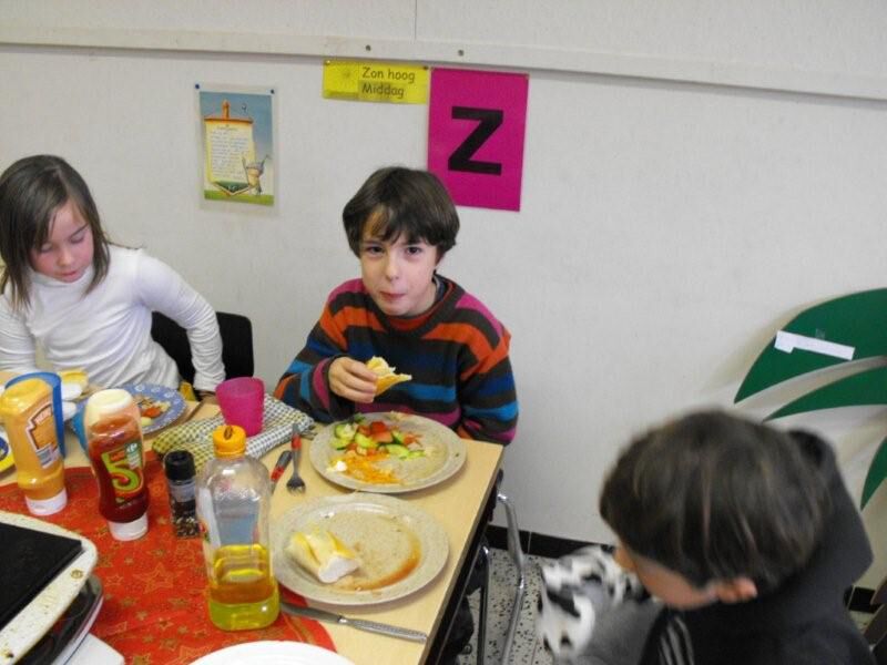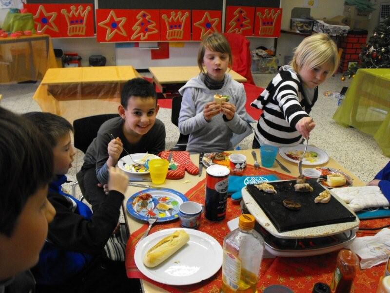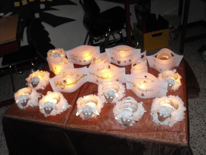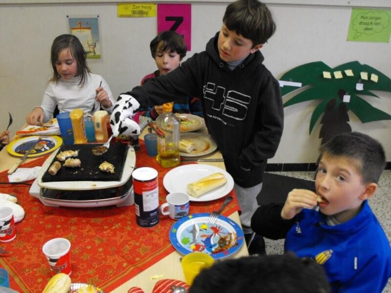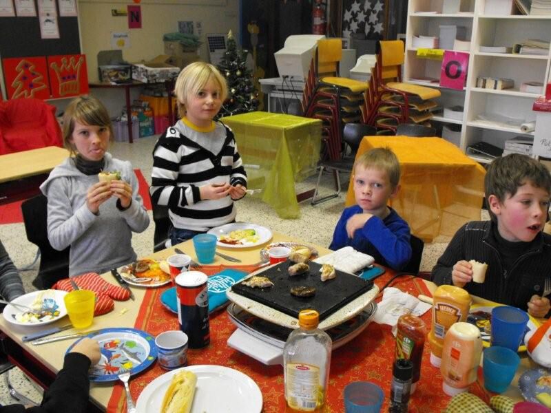 Wanneer ons schaap-lichtje klaar was begonnen we onze groenten klaar te maken. We sneden komkommers, tomaten en aardappelen. We kuisten sla en pelden hardgekookte eitjes. Tegen de middag konden we ‘echte’ beginnen met ons kerstdiner. We bakten ons eigen vlees op een gourmettoestel (met hete steen). Wat was dat een fijne ervaring. We aten allen ons buikje rond.