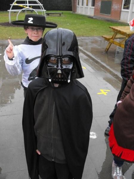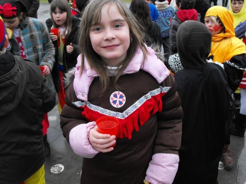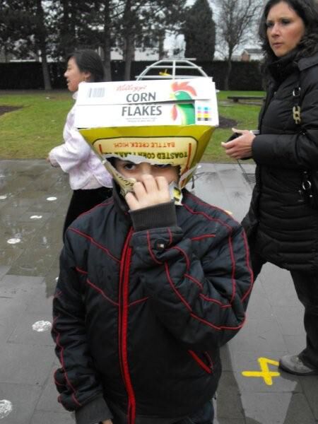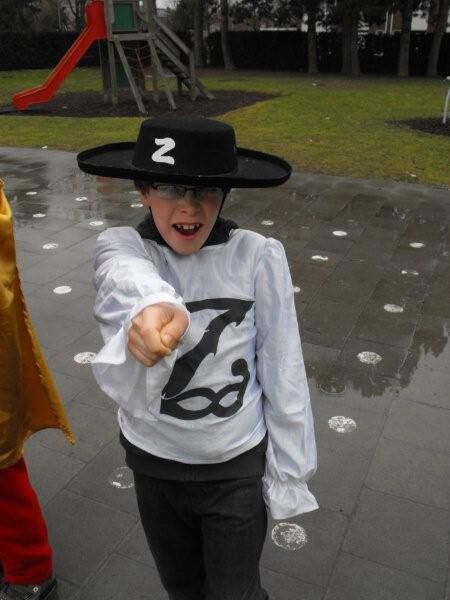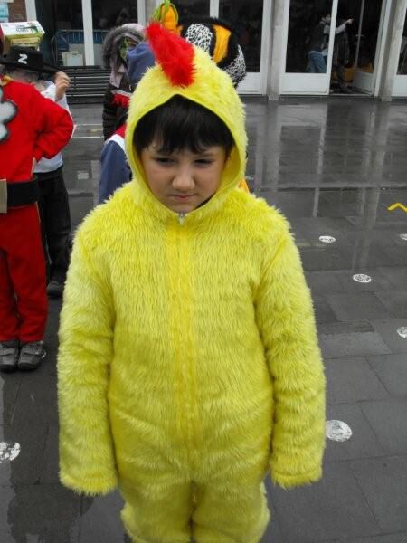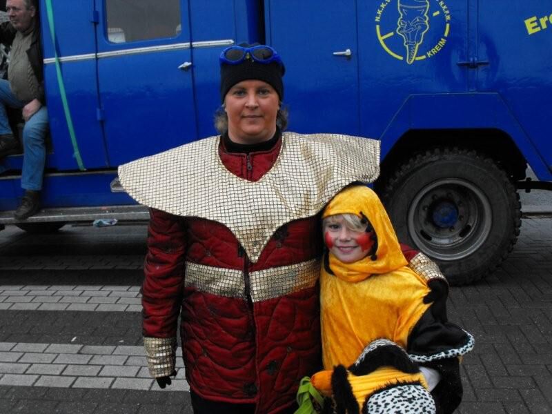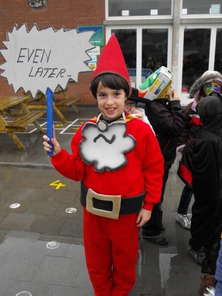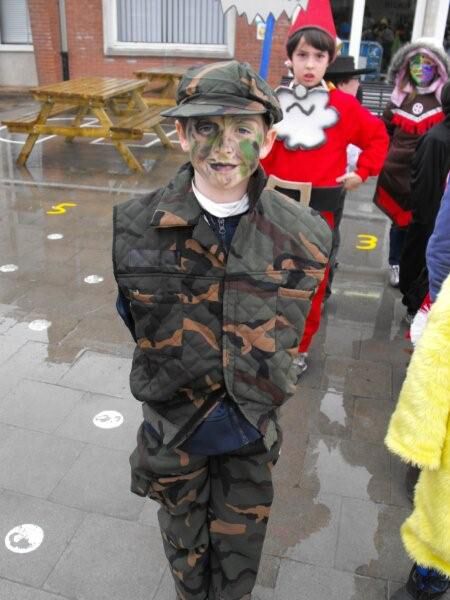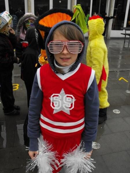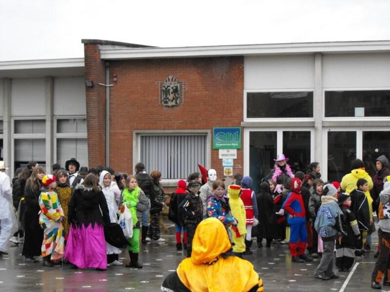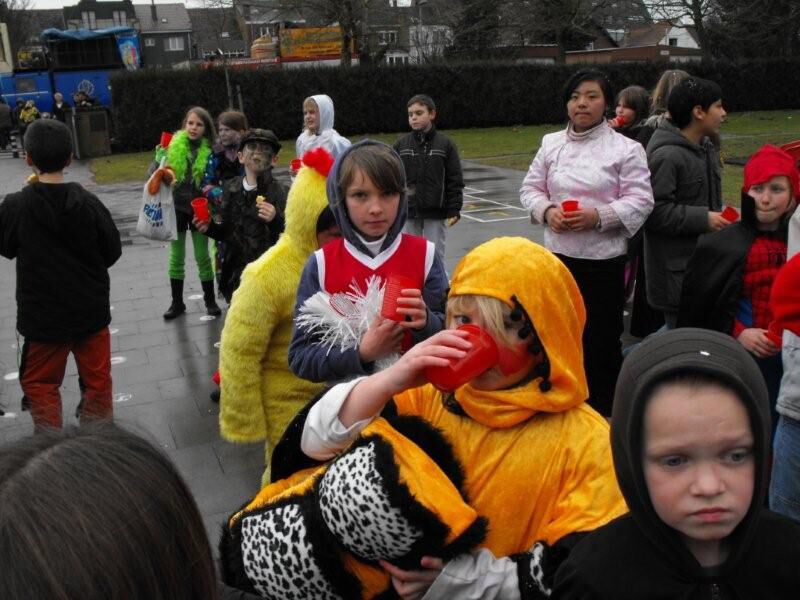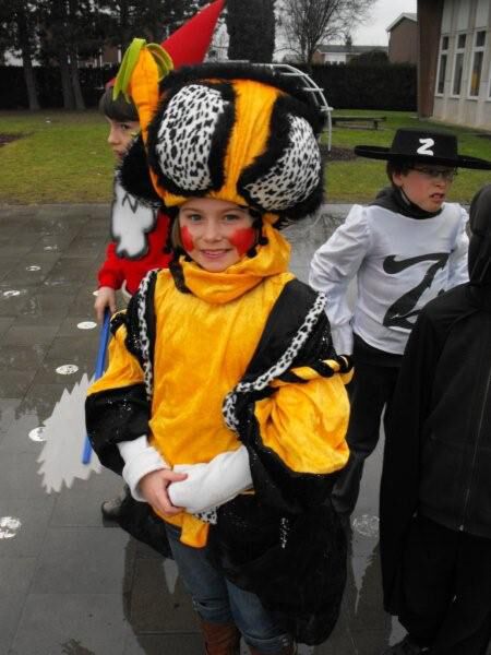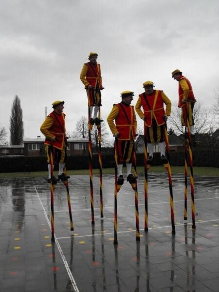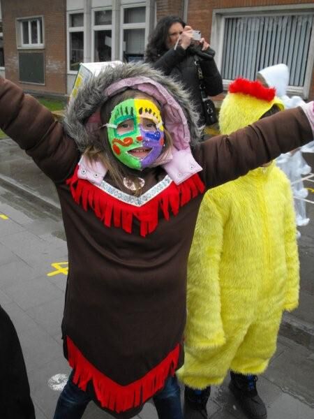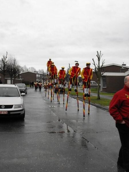 Tussen de regenbuien door trokken we op carnavalstocht door de straten van de wijk. Onze stoet werd opgevrolijkt met steltlopers (LUCHT, weet je nog