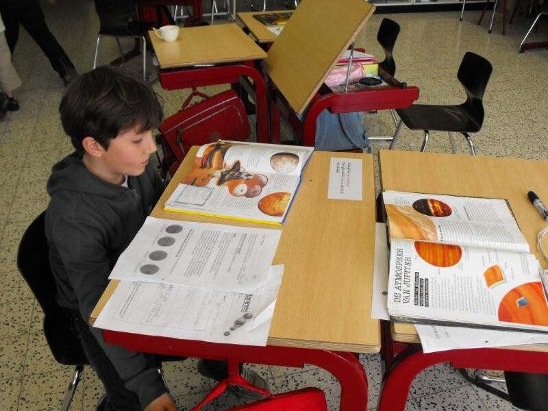 Het thema ruimte valt erg goed in de smaak. We werkten reeds enkele dagen in groepjes rond een bepaalde planeet. Vandaag mochten we die planeet dan ook voorstellen aan de klas. Morgen hangen we onze verkleinde planeet naast ‘de Zon’ en duiken we terug de infoboeken in op zoek naar weetjes over een andere planeet.