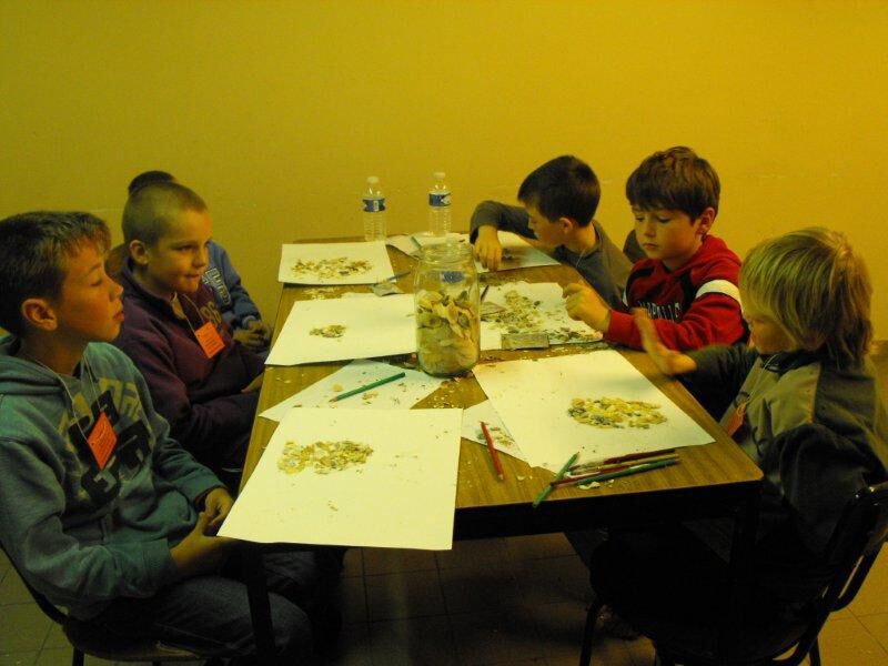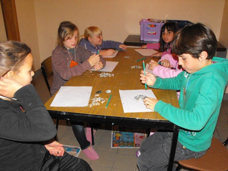Rond 14:30 werd het tijd om terug te keren naar het Reigersnest. We gingen onder leiding van meester Michiel naar het knutsellokaal en maakten met onze schelpen een kunstwerk (met James Ensor in het achterhoofd). Wat was dat hard labeur (we moesten de schelpen immers in kleine stukjes breken), maar het resultaat mocht er zijn.