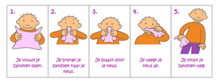 Toen we dinsdagochtend met z'n allen gezellig zaten te praten, moest Pippo heel hard niezen. En... er hingen vieze snottebellen aan zijn neusje! We namen snel een zakdoekje voor hem en Pippo trompetterde er op los! Daar moesten we erg om lachen! Pippo kan zijn neus al heel goed snuiten, en dat is niet zo gemakkelijk hoor! Hij leerde het ons via dit stappenplan: