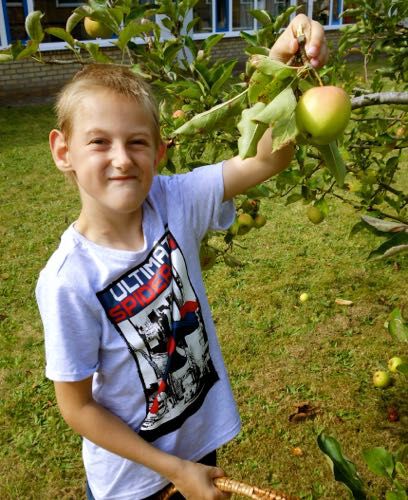 Vandaag trokken we ons klastuintje in om appeltjes te oogsten. Met die lekkere gezonde lekkernij gaan we vrijdag aan de slag in de keuken ! Iedereen mocht meehelpen plukken... daarna bekeken we onze oogst in de klas. We telden de appels in de mand, sorteerden ze van groot naar klein, maakten een afdruk met verf van een doorgesneden appel ... & gingen aan de slag met de ruimtelijke begrippen : in de mand/ onder de boom/ naast de boom/ aan de tak ...