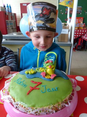 Feest in onze klas ! Onze lieve vriend Robin werd vandaag 7 jaar en dat hebben we gevierd met een lekker smulfeest ! De papa en mama van Robin trakteerden ons op een prachtige "Kikkertaart", die ze helemaal zelf gebakken en gedecoreerd hadden. Ja hoor, helemaal in ons Kikkerklas-thema en ook in ons thema : "lekkers van de bakker", want als je het mij vraagt mogen de ouders van Robin zeker ook een patisserie zaak opstarten ! De taart was eigenlijk te mooi om op te eten, maar anderzijds ook veeeeeeeel te lekker om er niet van te smullen... ze was echt om duimen en vingers van af te likken ! Nogmaals bedankt aan de mama en papa van Robin voor dit prachtige en heerlijke traktaat !