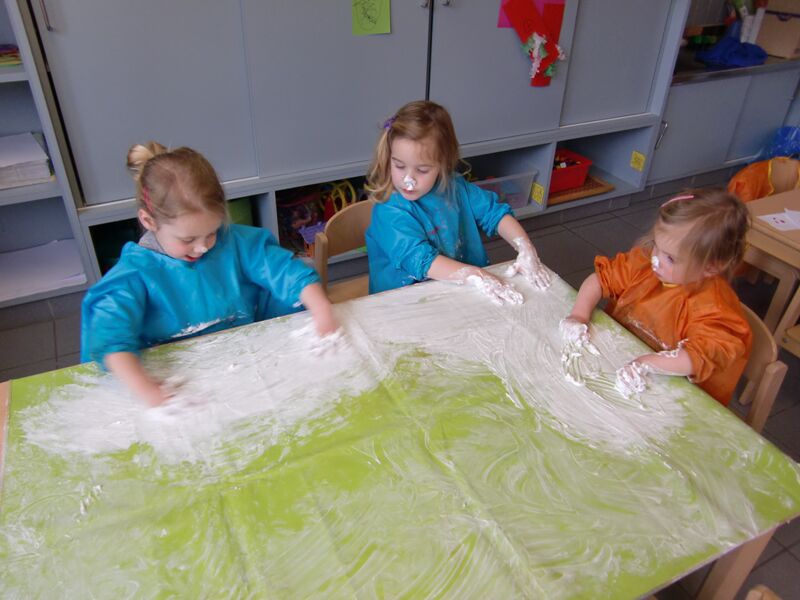 Onze juf vertelde dat sommige papa's wel eens een "prikkebaard" hebben... Ja, dat wisten we wel ! Maar om die baard weg te krijgen ; dat was net iets anders. Iemand vertelde dat zijn papa dat met een schaar deed; nog iemand anders zei : " Mijn papa scheert NOOIT zijn baard". Maar Jaimy wist te vertellen dat haar papa het met een "scheerder" deed. Knap hoor en vooral in die scheerschuim hadden we interesse. Kijk zelf maar....
