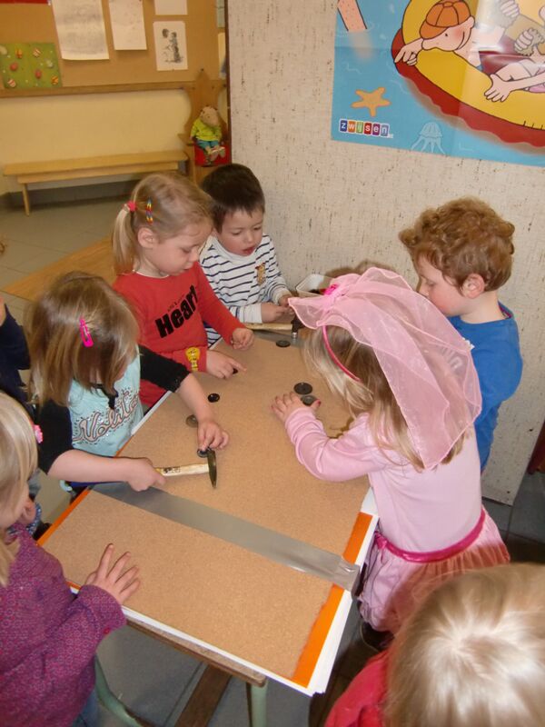 Met de ganse school werkten we rond hetzelfde thema : hout. We brachten allemaal een houten voorwerp mee naar de klas, gingen aan de slag met lijm en houtkrullen en tekenden met houtskool op gekleurd papier. Maar er was ook een echte timmertafel; wat hadden we weer veel om te ontdekken in ons klasje !!!