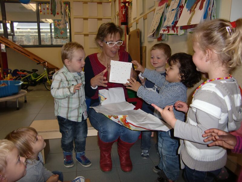 Met de ganse kleuterschool werken we 2 weken rond een gezamelijk thema : nl. Het spookje Laban. Dit gaat over een klein spookje dat een verrassing maakt voor het verjaardagsfeest van zijn papa. We kwamen maandag dan ook allemaal samen en zochten eerst een cadeautje. In de klas openden we het cadeau....wat zou daar in zitten ??? ( joepie, een slinger ) Deze week zal het kleine spookje Laban nog wel enkele keren aan bod komen... Volgende week vrijdag is er dan een groot verjaardagsfeest waar muziek, smink en lekkere dingen zullen zijn !!!