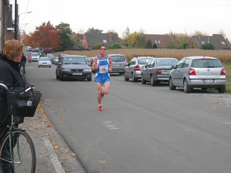Hallo, vandaag heb ik de moed nog eens samen kunnen scharten om een wedstrijd te lopen. Het ging om een 12km (direct heel veel) in Zwevegem. Het was ook onderdeel van het Mandel-Leie-Schelde Criterium, daar moet ik aan alle wedstrijden nog deelnemen om eventueel nog in de prijzen te vallen. Voor de wedstrijd viel het meteen op dat het deelnemersaantal heel laag lag. Dit nam niet weg dat er een paar toppertjes naar die koers afkwamen. Zo was er een marokaan (naam onbekend voor mij), Joost Dewaele, Dimitry Caby, Patrick Soetaert, Luc Van Asbroek, Bjorn Desmet,... Na de verkenning van het parcours bleek dat het niet zo evident zou worden. Er moesten 7 ronden afgelegd worden van telkens 1,714km (uit het hoofd uitgerekend ;-)) Het eerste gedeelte van het parcours is gespijsd met veel venijnige korte bochtjes. Het 2e gedeelte bevat vooral mooie rechte stukken met in de laatste 800m een helling die toch niet te onderschatten was. Met mijn huidig conditiepeil zag ik het maar matig zitten. Eens de start gegeven vloog ik er direct stevig in, ik ging mee met Dimitry, Joost en Luc. Van de Marokaan was geen spoor. We bleven met zijn 4en mooi samen, maar zoals je ook wel weet is dat tempo een heel tikkeltje te hoog voor me. Dus voor het einde van de eerste ronde liet ik de 3 begaan. Vanaf dan liep ik een vrij eenzame wedstrijd. Voor mij zag ik het drietal steeds verder weglopen en achter mij zat vrij ver ook geen groepje met onder andere Patrick Soetaert, Bjorn Desmet en Carlo Verleyen. In het midden van de 2e ronde vloog de marokaan me nog voorbij. Hij liep zo makkelijk dat ik direct bij mezelf dacht, Caby zal nog zijn père zien met die kerel. Eens de marokaan bij het koptrio kwam, zag ik dat Joost ook lostte uit het nieuwe 3tal. Vanaf de derde ronde zag ik de eersten niet meer strijden, enkel Joost zag ik nog af en toe op de rechte stukken. Vanaf dan was het eenzaam verder lopen, ik voelde wel mijn krachten afnemen vanaf de 4e ronde. Logisch na de weinige trainingsarbeid in september. Ik wist dat het moeilijk ging zijn om 5e te blijven. Op 1 ronde van het einde kwam Patrick Soetaert bij me. Op het eerst gedeelte van de laatste ronde kon ik hem nog volgen, maar op de helling moest ik mijn meerdere erkennen. Uiteindelijk was ik 6e in 43min40s en zeker niet ontevreden. Mijn voorlopige uitslag: 1 Marokaan ;-) 2 Dimitry Caby 3 Luc Van Asbroeck 4 Joost Dewaele 5 Patrick Soetaert 6 Dieter Van Lierde 7 Carlo Verleyen 8 Bjorn Desmet 9 Ignace Bekaert