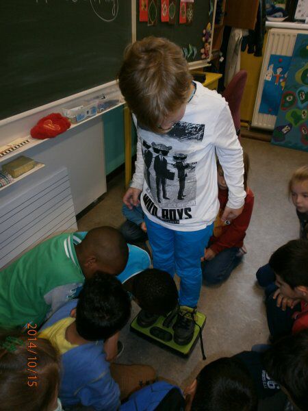 Nele bracht van "haar erf" een hele grote pompoen mee. "Hoeveel zou die wegen, Sofie?" "Ah, dat moeten we eens uitzoeken! We hebben eerst geschat en dan de pompoen gewogen. Dat die ongeveer 14 kg woog, dat was even schrikken. "Is dat meer of minder dan wat ik weeg?" Toen hebben we de personenweegschaal boven gehaald en zijn we er allemaal gaan opstaan.