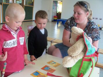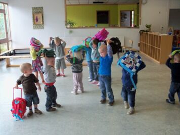 Fiere kleuters maakten de sprong van de peuterklas (groen) naar de eerste kleuterklas (rood). Al snel werd hun jas bij het juiste symbooltje gehangen. En na een bewegingsmoment met onze (nieuwe) boekentas werd deze in de juiste kast gezet. Onze enige peuter, Matice, volgde alles dapper mee. In de kring, de start van de dag, ging de meeste tijd in het aanbrengen van de kalenders: de daglijn, de aanwezigheids-, week- en weerkalender en het kiesbord.