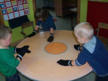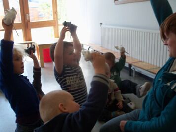 Op de muziek van TIK TAK stapten we een voelparkoer af op blote voeten. De kleuters slaagden erin te verwoorden of de voelplaat zacht of hard, koud of warm aanvoelde.