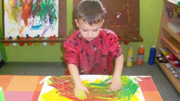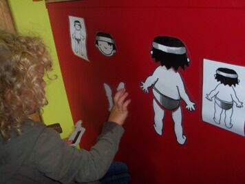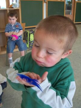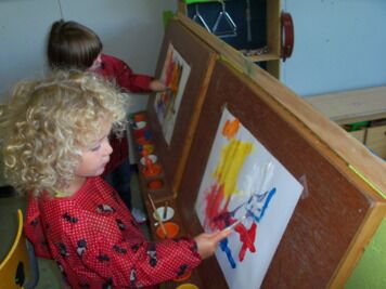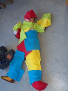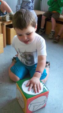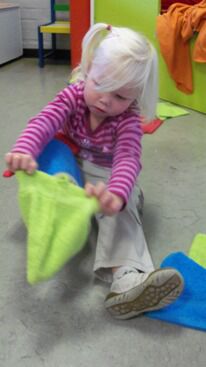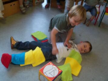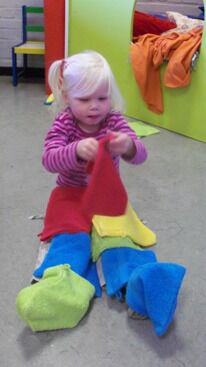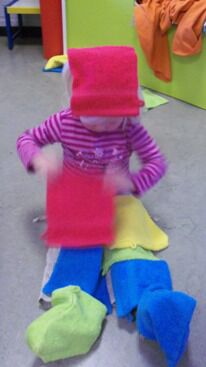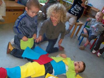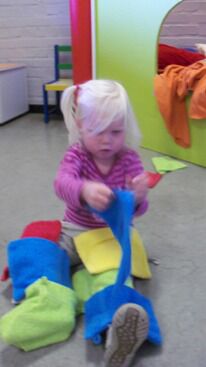 Allemaal verschillend, niet twee kleuters zijn identiek. We vergeleken elkaar. Wat is hetzelfde? Wat is anders? Hoe zitten de haren? Welk kleur van ogen heb je? Is iedereen even groot? Ben je een meisje of een jongen? Lichaamsdelen werden 'gemeten' met washandjes als maatstaf. Om de neus te verstoppen heb je maar 1 doekje nodig, voor de buik veel! Als afsluit kwamen 2 washandjes, Geeltje en Roodje, tot leven over de handen van de juf. De dobbelsteen gaf aan welk lichaamsdeel mocht dansen op de muziek van de tamboerijn. Enkele kleuters tekenden zichzelf of een vriendje, de jongsten van ons klasje experimenteerden met verf.