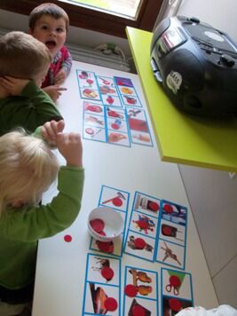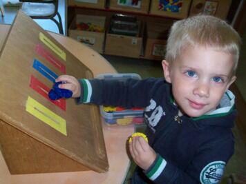 Verder zongen we ons kleurenlied, experimenteerden we met gekleurde magneten, bouwden kleurentorens, speelden raad en kimspelletjes, ... en natuurlijk keken we naar TIK TAK. (Niet op televisie, maar nagespeeld door de juf.)