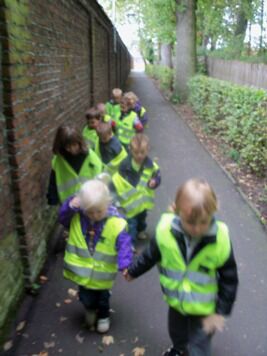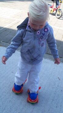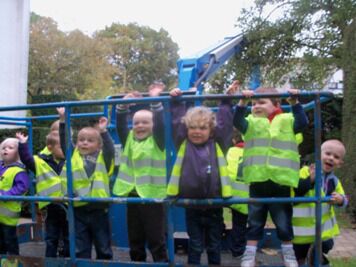 Woensdag gingen we op stap door de straten van Wevelgem om het verkeer te verkennen. De postbode op zijn fiet, de motorrijder met zijn helm op, de vuilniswagen, de auto's die stoppen voor het rode licht, de verkeersdrempels die de auto's trager doen rijden, verkeersborden, ... Wisten jullie dat elke straat een naam draagt? Mira herkende de 'Kloosterstraat', Mathis de 'Deken de Jonckheerestraat'. In de straat van Mathis trok een grote blauwe kraan onze aandacht. In de klas hadden we het al gehad over de vorm en de grootte van autobanden en fietswielen. De kleuters wilden dan ook snel weten of ze ook allemaal groter zouden zijn dan de wielen van de kraan. Alleen Ariano, Mathis en Mira waren nog net groter! Stond daar nu niet de lieve buurvrouw van Mathis, eigenares van het huis waar de kraan werken moet uitvoeren, ons glimlachend te observeren. Ze liet ons met de hele klas binnen in haar tuin zodat we de kraan in konden.