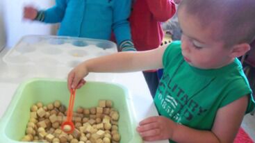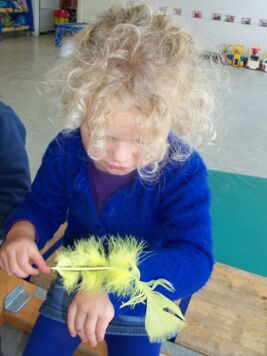 Maandag bouwden we samen een ballenbad in de klas, experimenteerden enkele kleuters met verf, en sneden we brood voor de kippen in kleine stukken. De kippen komen de kruimels uit onze hand pikken! Oud brood mag je steeds met je kleuter meegeven.