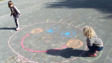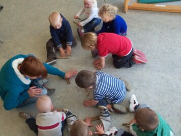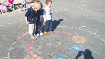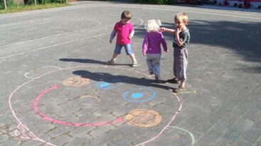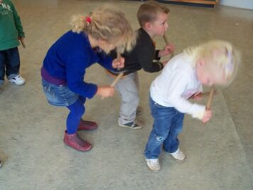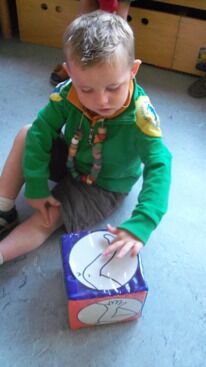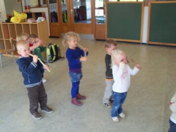 Deze week kreeg onze muziekhoek de nodige aandacht. We luisterden naar de klank van de cimbalen, bloktrom, tamboerijn (of is het tamboerderij, Arthur?), belletjes en triangel. Deze werden achter een muurtje gezet en wij probeerden te raden welk instrument we hoorden. Met de ritmestokjes tikken op de vloer, je schoen, je buik, ... maakt telkens een ander geluid. Je kan er ook harde en zachte, snelle en trage muziek mee maken. Een groot gezicht tekenden we met stoepkrijt op de speelplaats. Samen zongen we ons lied (zie mapje in de boekentas) en gingen op het juiste gezichtsdeel staan.