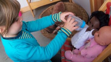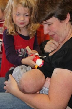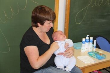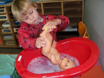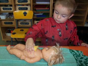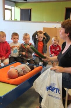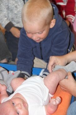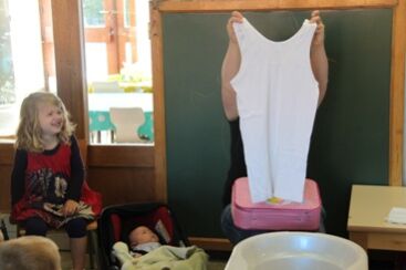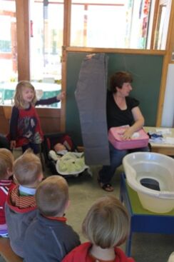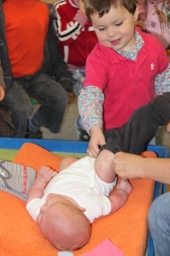 Woensdag is juf Nathalie baby Juul komen wassen. We zetten de verwarming aan en alles werd klaargezet: het badje met warm water, een verzorgingskussen, zeep, zalf, handdoek en washand. Juul had nog zijn pyjama aan. In zijn valiesje zaten verse kleren. Maar welke kleren pasten Juul? Juul vond het leuk in bad, hij huilde niet! Hij liet zich wel horen na de wasbeurt...hij had honger. Wat eten baby's? Komkommer of banaan? Terwijl Juul melk kreeg van zijn mama trakteerden Arthur en Louise met geboortesnoepjes en koekjes.