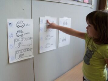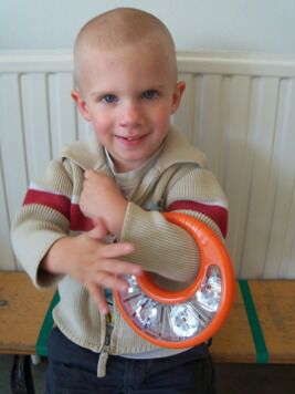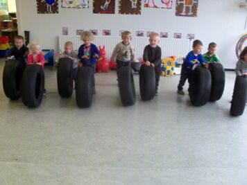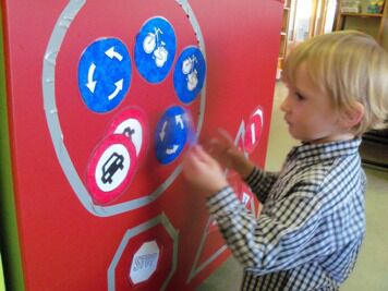 We brachten verkeersborden in de klas. Kleur? Vorm? Wat staat erop getekend? De ronde vorm was het gemakkelijkst te herkennen. We associeerden instrumenten met bewegingen (belletjes=fietsen, tikken van bloktrom=hoge hakken, rasp=moto), speelden oversteekspelletjes, buiten maakten we een fietsparkoer met verkeersborden, we probeerden vanalles uit met autobanden in de zaal, in ons verhaal kwam de chauffeur van de grote rode bus met een wiel vast te zitten in een put in de weg, en ons liedje vinden jullie maandagavond in het mapje in de boekentas.