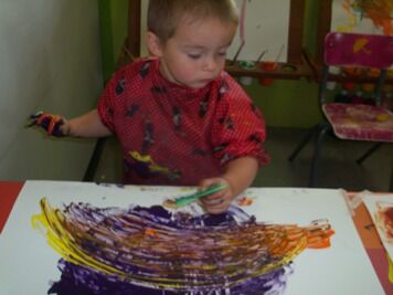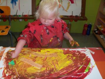 Auto's lieten we rijden door de verf en dan over papier. Elke auto maakte een eigen spoor: brede of smalle sporen, traktorsporen, gele of rode of ...