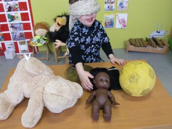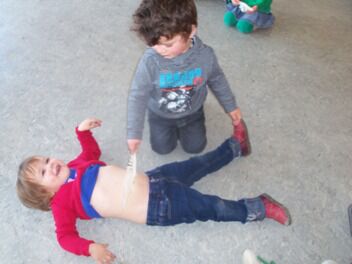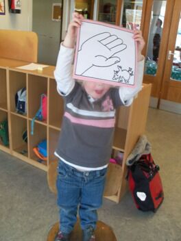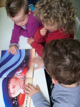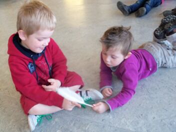 Waar de kleuters ook van genoten was het relaxatiemoment met kippenveren. Lotte toonde prenten van lichaamsdelen. Op dat lichaamsdeel mochten de kleuters wrijven met een veer.