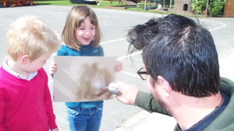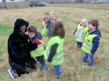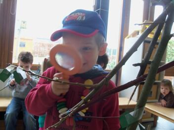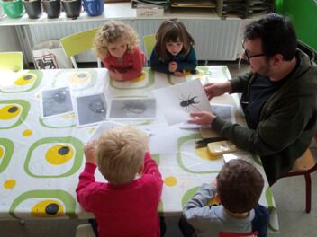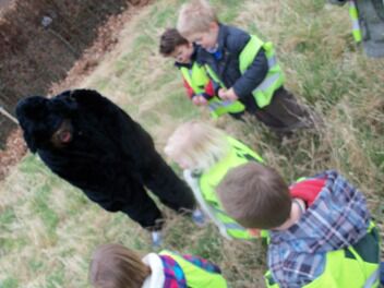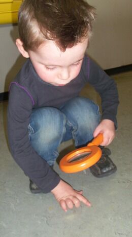 Zion zat iets te zoeken met een vergrootglas ... sporen van berenpoten.  Al snel volgden enkele kleuters Zion in zijn zoektocht.