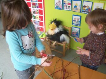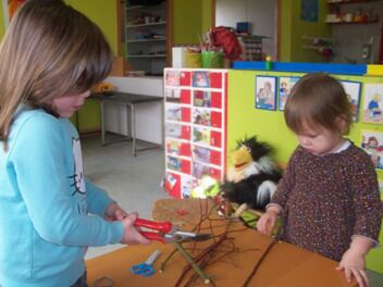 Lamya en Fiep vonden de takken te lang en haalden er een schaar bij om ze korter te knippen. Helaas, met een schaar geraak je niet door een tak. Met een snoeischaar gaat dit al beter.