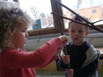 De takken probeerden we aan elkaar vast te maken met elastieken.