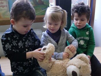 De beer kon maar eventjes blijven bij ons op school. Hij moet terug naar zijn kleintjes die alleen waren achtergebleven in het berenhol.