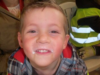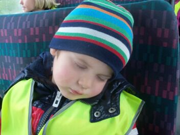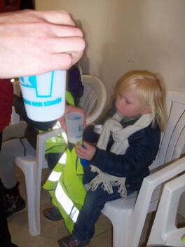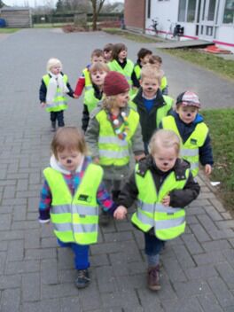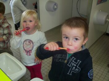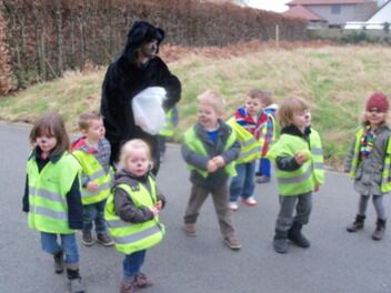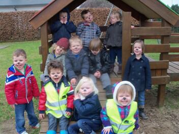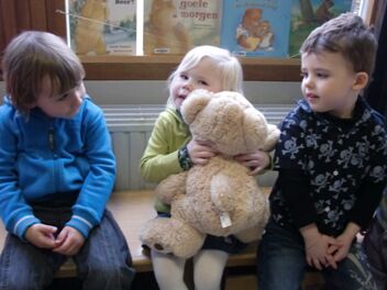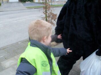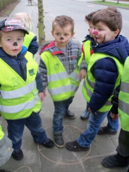 Voor we vertrokken werden we geschminkt in beer (Niet in hond he, moeke Els Very Happy), en ontstond een meningsverschil tussen de kinderen en de juf. Ik geloofde er niet in dat we een beer konden vinden. Een hond, kat of vogel leek me een haalbaardere kaart. De kleuters waren het er helemaal NIET mee eens!!! Je voelde de spanning in de lucht hangen...