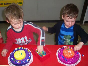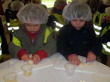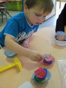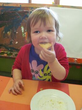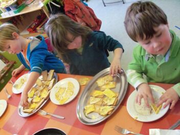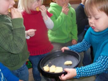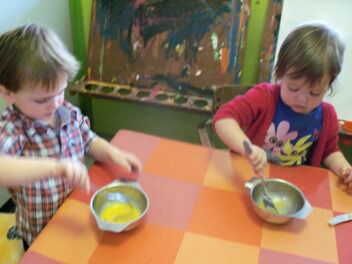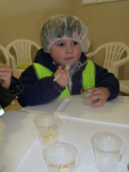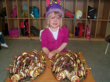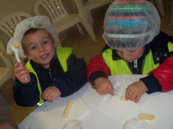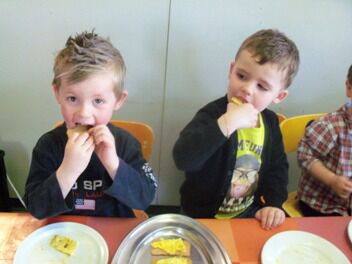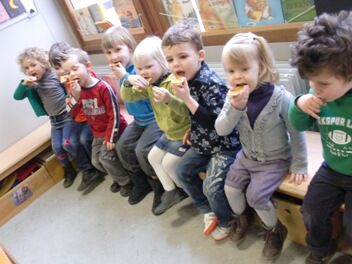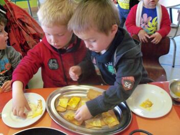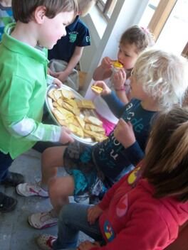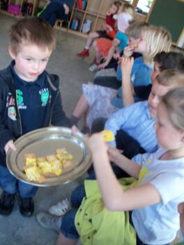 De kleuters van juf Nathalie hebben ons de afgelopen maanden al zoveel getrakteerd op lekkernijen dat zij nu ook eens mochten meegenieten van onze kookkunsten.
