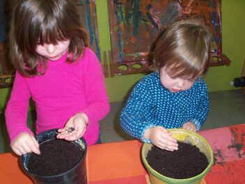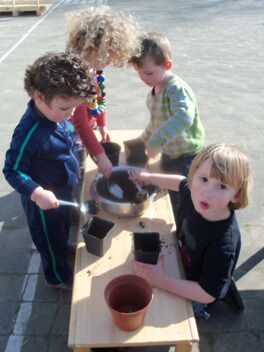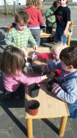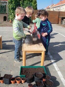 Eerst vulden we potten met aarde.
