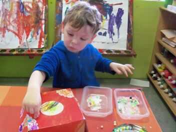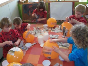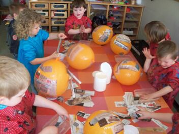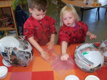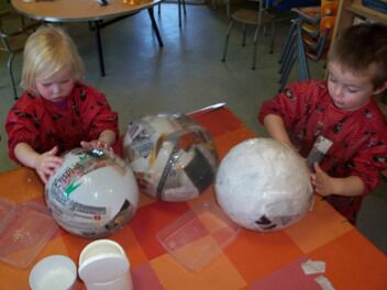 De kleuters van de eerste kleuterklas begonnen aan hun mandje voor de paaseierenraap op 30 maart. Niets vinden de kleuters leuker dan te mogen experimenteren. Hier kleven we stroken krant met behangerslijm op een ballon.