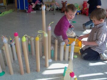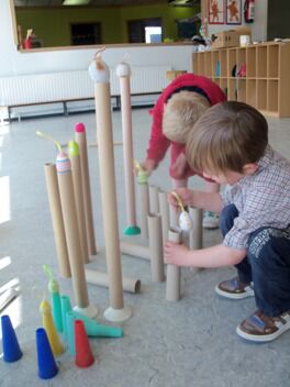 In de zaal stond een doos vol buizen. Dikke en dunne, lange en korte. Ook kegels en bobijnen vonden we in de doos. Hiermee kwamen we tot een prachtig bouwwerk.