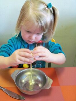 3 : Het eigeel met het eiwit mengen. (Kijk eens in het potje van Fiep, volgens haar is een rauw eitje             heerlijk Very Happy!)