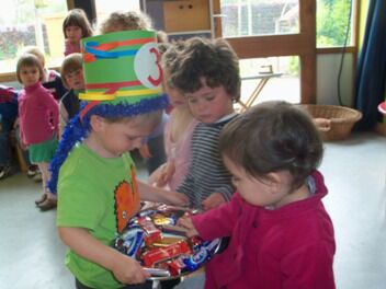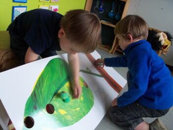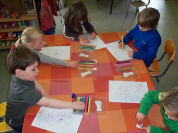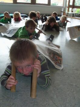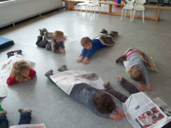 De kleuters kregen elk hun krantenhuisje om zich te kunnen inleven in het slakkenleven.We gingen op zoek naar eten maar bleven alert! Als de hongerige vogel kwam aangevlogen of als we een hard geluid hoorden trokken we ons terug in ons huisje.